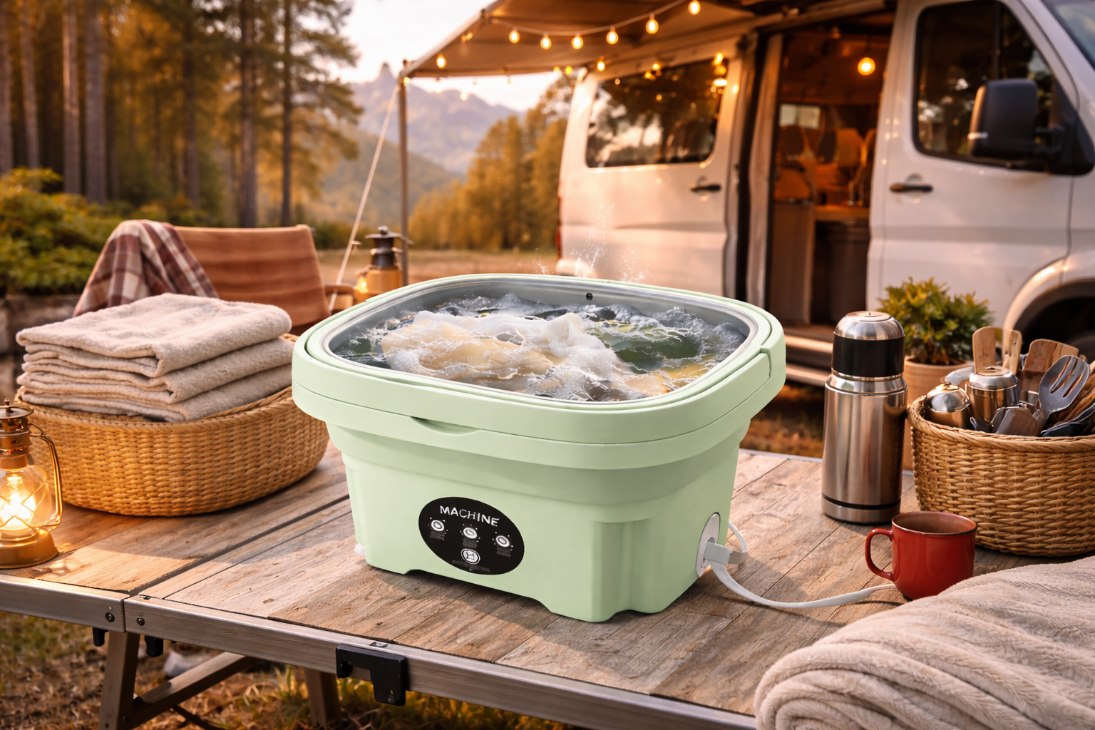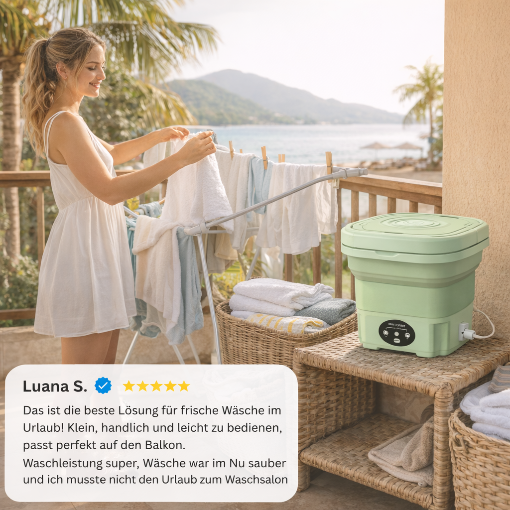 Mit der faltbaren Mini-Waschmaschine wäschst du deine Kleidung schnell, einfach und unabhängig – egal ob zuhause, im Urlaub oder beim Camping. Sie ist kompakt, kraftvoll und spart dir Zeit, Geld und Aufwand.